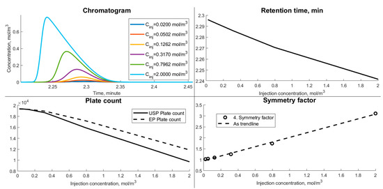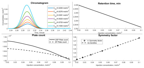 When the injection concentrations are low and vary in a small range as shown in Figure 6, the asymmetry factor, plate count, and retention time do not have any significant changes. However, when the concentration becomes extremely high as presented in Figure 7, it will cause overload, increase the asymmetry factor, decrease the plate count, and shift the peak forward.