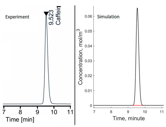 The validation experiments were carried out on the Agilent HPLC system, using the C8 reversed phase column; the column length is 250 mm, inner diameter is 4.6 mm, particle size is 5 µm, detection wavelength is 275 nm, and flow rate is 1 mL/min. The standard solution is caffeine 0.25 mg/mL. Some experiments were performed to calibrate the undefined parameters and validate the model. The HPLC Agilent 1260 Infinity II was used for running the sample. Information about the chemical reagents which were used for the sample preparation is presented in Table 1.