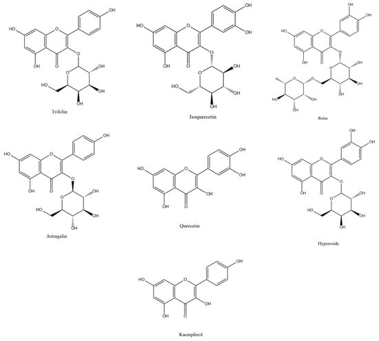 Structures of trifolin, isoquercetin, rutin, astragalin, quercetin, hyperoside, and kaempferol in Ribes mandshuricum leaves.