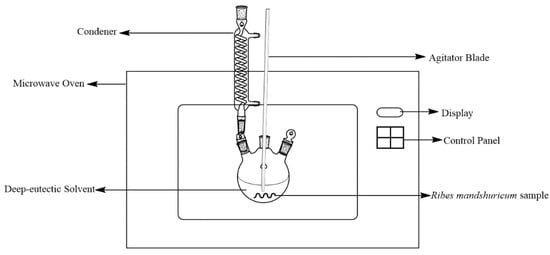 For microwave-assisted extraction, we used a modified MAS-II microwave oven, which was from Sineo Microwave Chemistry Technology CO., Ltd. (Shanghai, China). To mount a reflux condenser onto the oven, we drilled a hole in the outer casing, and to mount an agitator blade into the flask, we drilled another hole in the outer casing. Figure 2 showed a schematic figure of the MAE experimental setup.