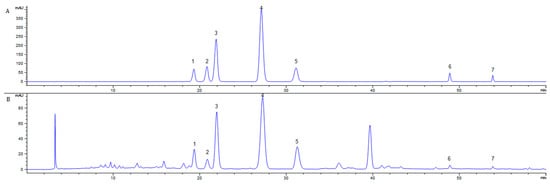 HPLC chromatograms of standard mixture (A) and extracts by DES-MAE in Ribes mandshuricum leaves (B) for (1) Rutin, (2) Hyperoside, (3) Isoquercetin, (4) Trifolin, (5) Astragalin, (6) Quercetin, and (7) Kaempferol.