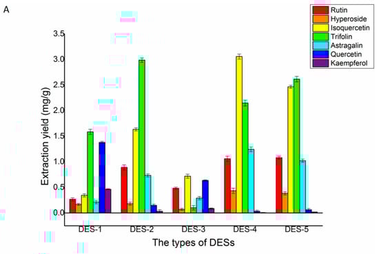 The different structures of DES determined they have different physicochemical properties. Consequently, different types of DES had different extraction yields of the seven target flavonoids. Thus, five different types of ChCl-based DESs were selected. Figure 4A depicted the extraction yields of the seven flavonoids. Compared with the other two solvents, using DES-2, DES-4, and DES-5 as solvents obtained higher concentrations of the flavonoids. Although the yield of isoquercetin in the DES-2 solvent was much lower than DES-4 and DES-5, the yields of trifolin, quercetin, and kaempferol in the DES-2 solvent were higher than DES-4 and DES-5. The different structures of DESs determined they have different physicochemical properties. The hydrogen donor of five DESs was different. The hydrogen donor of DES-1 and DES-2 was carboxylic acid. The hydrogen donor of DES-3 and DES-4 was polyalcohol. The hydrogen donor of DES-5 was sugar. Their viscosity, polarity, acidity or alkalinity, and ionic conductivity were different. The viscosity of DES-1 and DES-5 were larger than other DESs, the acidity of DES-2 was stronger than other DESs, and due to the polarity of quercetin and kaempferol, it was weaker than the other five flavonoids. The extraction yields of quercetin and kaempferol by lactic acid formed by DESs were higher than those formed by polyalcohol and sugar. In addition, the preferable extract yields of the seven flavonoids using DES-2 as a solvent may be due to their strong multi-interactions, including hydrogen bonding, π–π, and ionic/charge-charge with these flavonoids [32]. After all these comprehensive considerations, DES-2 was chosen as the extraction solvent for the extraction of the seven major flavonoids in Ribes mandshuricum leaves.