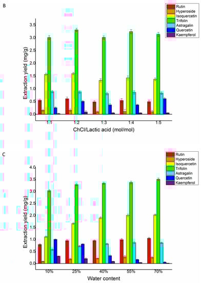 Effects of different DESs (A), choline chloride/lactic acid ratio (B), and water content of DESs (C) on the extraction yield of rutin, hyperoside, isoquercetin, trifolin, astragalin, quercetin, and kaempferol in Ribes mandshuricum leaves.