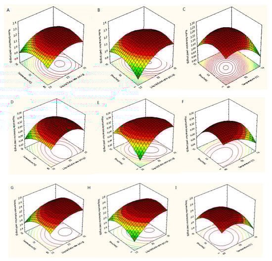 Figure 5 showed the three-dimensional (3D) response surfaces exploited from the fitted quadratic polynomial equation. In order to express the interactions between the operating variables and the responses, one independent variable remained at an intermediate level, whereas other variables changed within the defined ranges. Figure 5A,D,G,J,M,P,S showed 3D diagrams of the response surface for the yields of trifolin, isoquercetin, rutin, astragalin, quercetin, hyperoside, and kaempferol as connected with X1 (L/S ratio) and X2 (temperature), respectively. In those plots, it was found that the yields of quercetin and kaempferol increased with increasing the L/S ratio and extraction temperature, and the extraction yields of rutin, hyperoside, trifolin, and astragalin increased with increasing the L/S ratio and decreasing temperature. Raising the L/S ratio from 15 to 32 mL/g with temperatures from 40 to 65 °C improved the extraction yields of the seven target flavonoids, but their extraction yields did not continuously improve when the L/S ratio and temperature exceeded 32 mL/g and 65 °C. As shown in Figure 5B,E,H,K,N,Q,T, the interaction between the L/S ratio and the extraction time was similar to that between the L/S ratio and the extraction temperature. The yields of trifolin, isoquercetin, rutin, astragalin, quercetin, hyperoside, and kaempferol first increased and then decreased with increasing the L/S ratio and extraction time. Adding the extraction time from 5 to 12 min improved the extraction yields of the seven flavonoids, whereas their extraction yields did not continuously improve when the extraction time exceeded 12 min. Figure 5C, F, I, L, O, R, U showed the extraction yields of rutin, hyperoside, isoquercetin, trifolin, astragalin, quercetin, and kaempferol as related to X2 (temperature) and X3 (time), respectively. Its results were similar to that of the above.