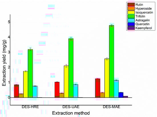 Comparison of different extraction methods on the extraction yields of rutin, hyperoside, isoquercetin, trifolin, astragalin, quercetin, and kaempferol.