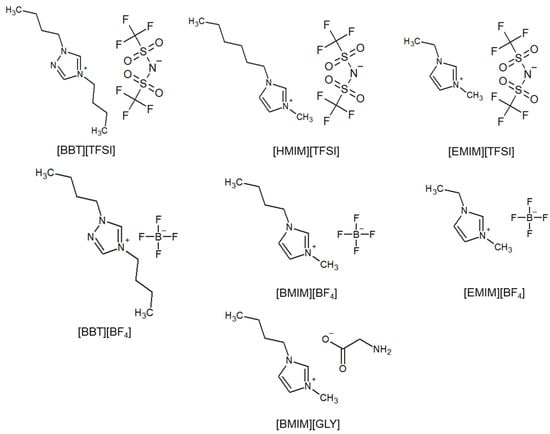 In this work, the synthesis of [BBT][BF4], [BBT][TFSI], [BMIM][BF4], and [BMIM][GLY] was carried out in accordance with the procedures outlined in our earlier publication [51]. [EMIM][BF4] (≥98.0%), [EMIM][TFSI] (≥97.0%), and [HMIM][TFSI] (≥98.0%) were procured from Sigma Aldrich.