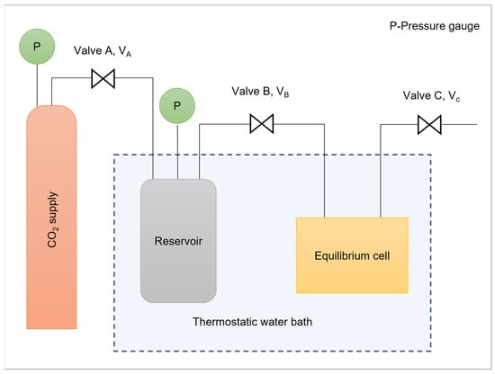 The isochoric saturation method to determine the CO2 absorption capacity in the pure ILs was adapted from procedures reported in literature [52,53,54,55,56]. The experiments were carried out in a 15 mL capacity stainless steel high-pressure equilibrium cell (EC), as seen in Figure 2. A pressure gauge controller was attached to the system to maintain the required pressure (5 bar) and a water bath was used to maintain the cell at 25 °C.