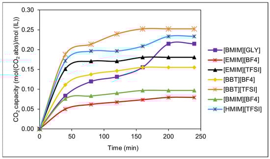 From the results shown in Table 1 and Figure 3, it can be observed that the order of CO2 capacity in ILs starting from the highest is [BBT][TFSI] > [HMIM][TFSI] > [BMIM][GLY] > [EMIM][TFSI] > [BBT][BF4] > [BMIM][BF4] > [EMIM][BF4]. The triazolium-based ILs recorded high CO2 absorption capacity compared to the imidazolium-based ILs, with the results of the latter consistent with other reported data [43,72,73,74,75]. It can be seen that the higher the molar volumes, the higher the absorption capacity, except for the case of [BMIM][GLY]. The absorption mechanism can be classified either by physisorption or chemisorption, with the latter being governed by a rate-limiting process but resulting in higher absorption capacity [76]. This can be seen in [BMIM][GLY], where a sharp increase of CO2 absorption is observed until it stabilizes to its maximum capacity, which can be classified to follow the chemisorption process. On the other hand, in the case of physisorption, the CO2 solubility depends on the fractional free volume of the ILs, which explains the good solubility of the large delocalized anions [TFSI] compared to [BF4] [77]. Further investigations were performed to determine the factors that influence the absorption types in ionic liquids, and parameters such as the type of cations, anions, and the alkyl chain length were taken into consideration.