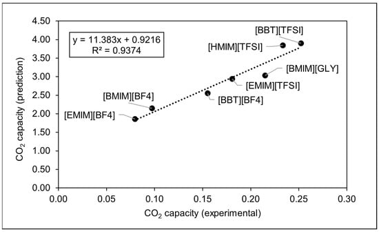 Figure 4 depicts the CO2 capacity for different ILs through experimental and computational methods using COSMO-RS. By comparing the two methods, a linear regression (y = 11.381x + 0.9218) was obtained with R-squared value of 0.9374. It is noteworthy to highlight that the values from COSMO-RS are larger than the experimental results because COSMO-RS is a qualitative tool, and the capacity values are computed by employing the infinite dilution activity coefficients of the ILs. The COSMO-RS is therefore an effective tool for estimation of thermodynamic properties and reliable for prediction of gas solubility properties for new ionic liquids.
