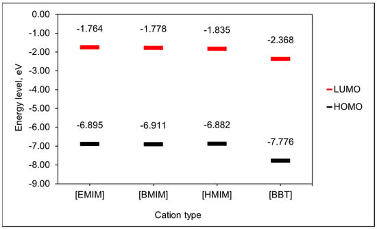 On the other hand, to investigate the impact of cations on CO2 absorption in ILs, the CO2 capacity values for [BBT][BF4], [BMIM][BF4], and [EMIM][BF4] are compared, while Figure 6 displays the HOMO–LUMO energy levels of the cations.