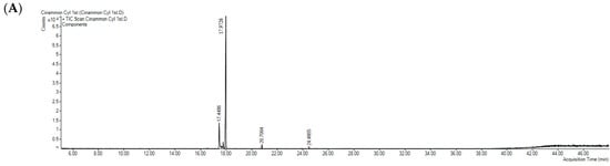 Chromatograms of the analyzed samples were recorded utilising using Agilent 7890B gas chromatography fitted with HP-5 19091J-413 (30 m × 0.25 mm) capillary column and FID detector. Conditions similar to the GC/MS analysis were adopted. The area for each peak was measured automatically to enable peak quantification. Identification of the EOs’ chemical compositions was based on a comparison of the compounds’ mass spectra with the NIST database and a comparison of their retention indices, relative to a series of n-alkanes C7–C40 (49452-U) (RRI), with the reported literature values using NIST 2017 (National Institute of Standards and Technology, Gaithersburg, MD, USA).