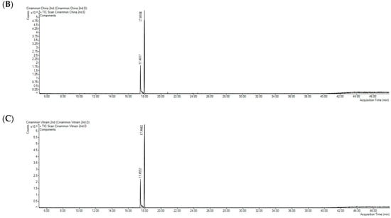 GC chromatograms of the EOs obtained by hydrodistillation from C. verum (A), C. cassia (B) and C. loureiroi (C).