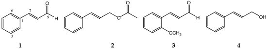 Cinnamon, whether grown wildly or cultivated, requires a temperature between 20–30 °C, annual rainfall from 1250 mm to 2500 mm and an altitude of 300–350 m from sea level []. In all the producing countries of the three species used in our study, the plants are grown in tropical areas with a temperature range of 25–32 °C [,]. It seems that the major factor in the minor differences between the three types is the biosynthetic process of the plants rather than the weather conditions that express minor variations. C. verum was the only species that could produce the 2-mono-oxygenated derivative 3.