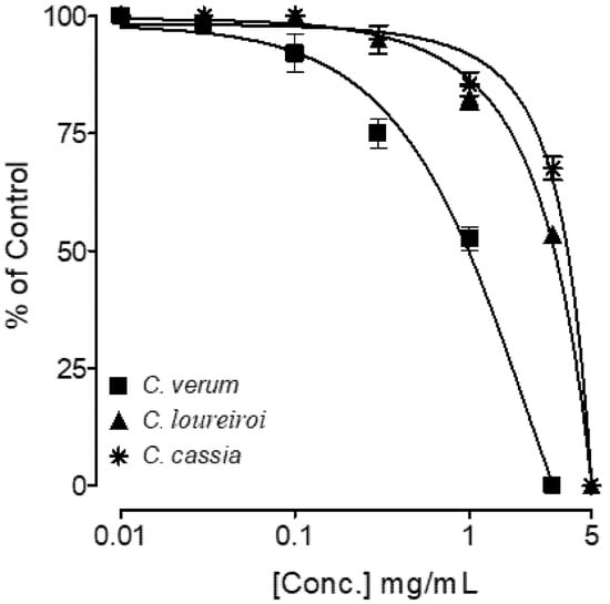 Concentration–response curves showing the comparison of the essential oil C. verum, C. bureiroi and C. cassia for the bronchodilator effect against carbachol (CCh; 1 µM)-induced contractions in guinea pig tracheal strips preparations. Results are expressed as mean ± SEM, n = 4.