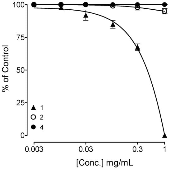 Among the pure compounds tested, complete inhibition of CCh-1 uM mediated contractions was observed using 1 with resultant EC50 values of 0.40 mg/mL (0.29–0.54; n = 4) while non-significant (p > 0.05) inhibition was observed with compound 2 with maximum relaxation of 5% whereas compound 4 was found inactive at the highest tested concentration of 1 mg/mL (Figure 4).