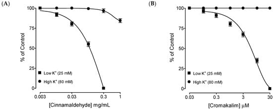 Concentration-dependent bronchodilator effect of (A) cinnamaldehyde and (B) cromakalim, against low K+ (25 mM) and high K+ (80 mM)-induced bronchoconstriction using isolated guinea pig tracheal strip preparations. Results are expressed as mean ± SEM, n = 4.