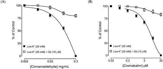 When evaluated on the high K+ (80 mM)-evoked spasms, 1 showed partial relaxation (14%, n = 4) at the highest tested concentration (1 mg/mL), but the low K+ (25 mM)-evoked spasm was completely reversed with recorded EC50 value of 0.18 mg/mL (0.10–0.26, n = 4) as shown in Figure 3A. Cromakalim also caused selective relaxation of the contractions induced by low K+ with an EC50 value of 6.32 µM (5.82–7.25, n = 4), with no effect on the high K+ (80 mM)-induced bronchoconstriction (Figure 5B). Pretreatment with the ATP-mediated K+ channel blocker glibenclamide at 10 µM, the bronchodilator effect of cinnamaldehyde against low K+ (25 mM)-induced bronchoconstriction was significantly reversed (Figure 6A), similar to the suppressive effect resulted from cromakalim on tissues pretreated with glibenclamide (Figure 6B).
