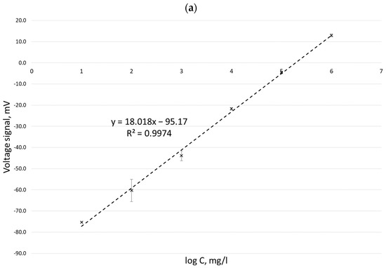 It is important to keep the temperature constant during the entire test (in the range of 20–25 °C) because, depending on the temperature, the measurement results may fluctuate. According to the manufacturer, the temperature range of the ISE operation is equal to 0–40 °C. Maintaining the pH of the measuring environment also influences the measurement, and the environment is stable in the range of 1.5–12.00 pH.
