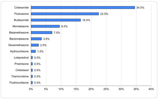 The surveyed athletes declared the use of GCs in the week preceding doping control in 7.6% (n = 162) of the cases. There were 30 different medicines containing 13 GCs. The most frequently used preparations were Alvesco® (34.5%), Symbicort® Turbuhaler (15.0%), and Dymista® (14.0%). It was found that 21% of athletes using GCs take two preparations from this group at the same time, and 1.2% use three medicines at the same time. The most frequently used substances are cyclesonide (34.0%) and fluticasone (22.5%) (Figure 1). We did not observe a different prevalence of GC use between in- and out-of-competition periods (p = 0.662) while injections were only reported during out-of-competition controls.