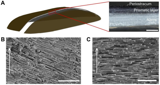 Nacre is a material with a hierarchical structure, as can be seen in Figure 1. Its fundamental structure consists of organic and inorganic components, including inorganic aragonite layers within the layers of the polymer matrix [13]. There are two layers with different microstructures observed in shells containing nacre: the calcite layer and an inner aragonite layer [4]. The natural role of nacre itself is to protect the shell from any breakage and damage due to its high mechanical properties [14,15,16,17,18]. Nacre has a tensile strength ranging from 80 to 135 MPa and a Young’s modulus from 60 to 70 GPa [19]. Due to its excellent mechanical properties, nacre is of interest to many researchers. The superior mechanical stability of nacre in seashells is related to hard minerals and soft polymers existing in nacre’s structure [20]. Nacre owns a brick-and-mortar structure, where soft biopolymers are attached to inorganic hard aragonite layers to form tiles, acting as high-performance adhesives [10,11]. This tough and iridescent biomaterial is made up of 95% aragonite calcium carbonate, which is the rigid part, and glued with 5% of proteins and polysaccharides as biopolymers [20]. The modulus of nacre is far superior compared to cortical bone which is around 10 to 30 GPa [21], and also higher in comparison with peritubular dentin at around 40 to 45 GPa [22].
