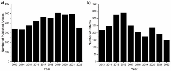 Trend of published (a) papers and (b) patents for artificial nacre. Data extracted from Web of Science for papers and Lens for patents.