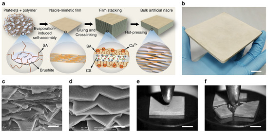 Gao et al. demonstrated the scale-up of self-assembly techniques by fabricating a three-dimensional bulk form of artificial nacre via a bottom-up assembly process based on laminating prefabricated two-dimensional nacre-mimetic films (Figure 3) [46]. The fabrication began with a mixture of calcium phosphate platelets and SA inducing facial interaction through Ca2+–SA coordination [46]. The diffusion of Ca2+ ions has been shown to induce mineralization which can prevent moisture traps [47]. This mixture underwent evaporation-induced self-assembly, followed by interaction with chitosan through strong electrostatic interaction via the carboxyl groups of SA and the amine groups of chitosan, followed by cross-linking using CaCl2 which can improve the platelets’ orientation degree [46]. This method produced a composite with a tensile strength of around 75 MPa, and a Young’s modulus of around 2.1 GPa [46]. However, the ultimate flexural strength at 267 MPa could surpass that of natural C. plicata nacre at 172 MPa, but the ultimate stiffness at 18.6 GPa was lower than that of natural C. plicata nacre at 48.9 GPa [46]. The biomimetic mineralization approach has been demonstrated to produce high performance bulk materials [48].