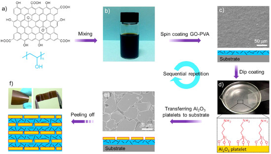 Layer-by-layer bottom-up assembly of multilayered Al2O3/GO−PVA artificial nacre. (a) GO and PVA. (b) Mixing of PVA and GO nanosheets. (c) Spin coating one layer of GO−PVA onto a glass substrate. (d) Assembling silane-modified Al2O3 microplatelets into a monolayer at the air−water interface. (e) Transferring the assembled Al2O3 monolayer onto the GO−PVA layer. (f) The obtained flexible, foldable artificial nacre after sequential repetition. Reproduced from ref. [29] with permission of the American Chemical Society.