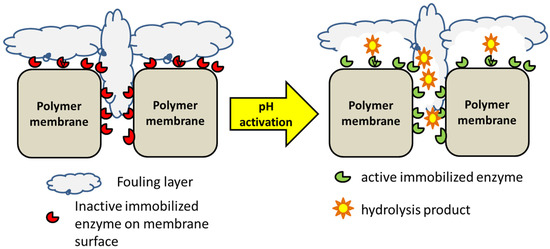 Schematic mechanism of self-cleaning membranes. By altering the pH of the buffer, digestive enzymes immobilized on the membrane surface become active and break down the substrates that cause fouling. Reproduced from ref. [82] with permission of Elsevier.