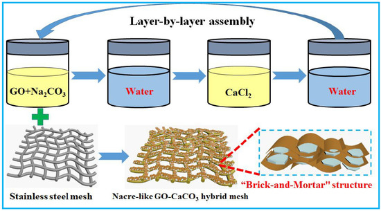 Schematic description of the fabrication of the nacre-like GO-CaCO3 hybrid mesh for oil–water separation. Reproduced from ref. [24] with permission of the American Chemical Society.