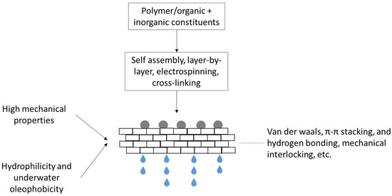 Oily wastewater is a type of wastewater with a high oil content, which, in the petroleum industry, can be generated from produced water brought to the surface during oil and gas production. This wastewater can contain many harmful components and usually consists of grease, oil, and other type of hydrocarbons, as well as high levels of metals, salts, and suspended solid elements [1]. The sources of oily wastewater are quite broad, covering offshore drilling, the oil industry, oil refining, oil storage, transportation, and petrochemical industries [2,3]. The estimated global production of crude oil reaches 41 million m3/day, with the production of a barrel of oil also producing three barrels of water [4]. The generation of produced water increases when the oil well ages [5]. The treatment of oily wastewater has been very costly so far, involving several techniques, such as flotation, coagulation, biological treatment, and advanced oxidation process, including electrochemical catalysis and supercritical water oxidation [6,7,8]. Any other approaches require a large space, a long processing time, a high cost, and often cannot meet the stringent treatment requirement for discharge or reuse [4,9,10]. Membrane technology has been of great interest due to its potential advantages of simple systems, a short process time and hence small footprint, and high separation efficiency [4]. The membrane selectively separates oil and water through its microporous structure, and could demonstrate high effectiveness of purification [10]. By mimicking the structure of strong natural materials, such as nacre, membranes with advanced, robust, and durable properties can be fabricated.