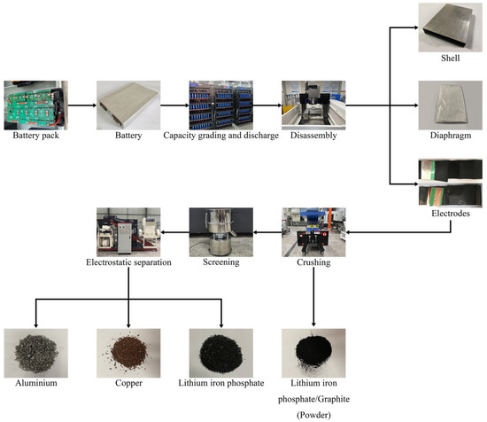 Lithium iron phosphate batteries have been widely used in energy storage equipment, electric vehicles, medical equipment, and other fields because of their high energy density, safety, cycle life, and good economic value. The scrap amount of such batteries will increase annually following their retirement period [1]. By the end of 2021, China’s total scrap of new energy power batteries has reached 27 GWh, and it is expected to reach 74.2 GWh by 2025 [2]. A large amount of solid waste is continuously generated in this process. However, without proper management and recovery measures, the metal elements in the battery, residual organic solvents, and volatile acid gases may pose serious threats to the environment [3]. On the contrary, the continuous expansion of the production scale of lithium iron phosphate batteries has led to a gradual increase in the demand for cathode materials. Therefore, the recovery of cathode materials and valuable metals from waste lithium iron phosphate batteries not only has broad economic potential, but also guarantees the sustainable development of the battery industry, thereby reducing pollution emissions and resource waste. Considering that the composition of the lithium battery is complex and diverse, and the material regeneration process chain needs high-purity materials, the environmentally friendly and efficient material separation technology is a necessary process in the material recovery process.