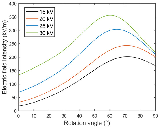 The electrostatic pole voltage changes to 15–30 kV, the electric field distribution of any plane perpendicular to the axis is intercepted for analysis, and the rule of the electric field intensity distribution is changed with the rotation angle of the grounding rotor, as shown in Figure 6. When the crushing products rotate with the grounded rotor, the electric field strength across the conductor surface increases initially and then decreases. Increasing the voltage of static electrodes can not only improve the overall electric field strength but can also make the peak of the electric field strength move forward, which is conducive to the early separation of the conductor material.