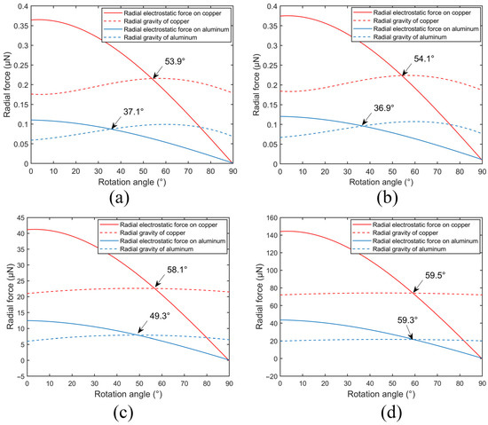 The physical properties and electric field intensity distribution state of materials with different particle sizes are introduced into Formulas (5) and (6) to explore the initial position and critical motion state of material leap motion. Figure 7 shows the change in the stress condition state of the conductor material with the direction angle under the condition of each particle size. The intersection of the image shows the critical condition that the external force of the material only provides the centripetal force, i.e., the initial separation position of the material. Among them, the electrostatic forces of lithium iron phosphate particles with a particle size of 0.2–2 mm are all less than 10−5 μN. It is far lower than its gravity, and the calculated results of the critical detachment angle of each particle size are close to 90°; hence, it is difficult to synchronously mark them in the figure. This indicates that this material is hardly affected by electrostatic force, and its running track is approximately free-falling along the edge of the rotor, while the very small particles rotate with the rotor under the electrostatic adsorption and are finally removed by the dust collector. This is because the resistivity of lithium iron phosphate is more than 105 orders of magnitude different from that of copper, aluminum, and other metal materials, and has a very poor charging effect [31].