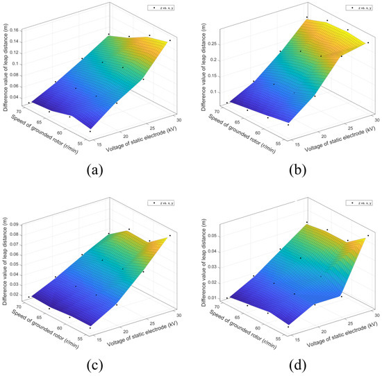 As shown in Figure 8, within the particle size range of 0.2–2 mm, the separation distance between different materials increases with the increase in electrostatic pole voltage, and initially increases and then decreases with the increase in material particle size and the rotation speed of the grounding roller. The key sequence of influencing factors is particle size > voltage of static electrode > rotation speed of grounding roller. Meanwhile, when the particle size is 0.5 mm, the electrostatic pole voltage is 30 kV, and the rotating speed of the roller is 55–60 r/min, the theoretical separation distance reaches the maximum. Furthermore, if the particle size range continues to be expanded, when the particle size of the crushing product is greater than 2 mm, the separation distance decreases monotonously and the value is less than 0.05 m. Therefore, crushing lithium iron phosphate battery products with a diameter of more than 2 mm are not suitable for electrostatic separation.