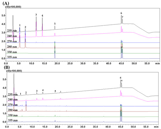 Representative HPLC chromatograms of the standard solution (A) and GJD–1 sample (B). Gallic acid (1), 5-(hydroxymethyl)furfural (5-HMF, 2), morroniside (3), loganin (4), nodakenin (5), decursin (6), and decursinol angelate (7). The concentrations of the compounds in the mixed standard solution were 20.00 µg/mL (compounds 2 and 5), 30.00 µg/mL (compounds 1, 3, and 6), and 40.00 µg/mL (compounds 4 and 7).