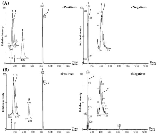 Representative total ion chromatograms of the standard solution (A) and GJD–1 sample (B) using UPLC–MS/MS MRM. Gallic acid (1), morroniside (2), 5-HMF (3), loganin (4), nodakenin (5), decursin (6), and decursinol angelate (7). The concentration of all analytes in the mixed standard solution was 5.00 µg/mL.
