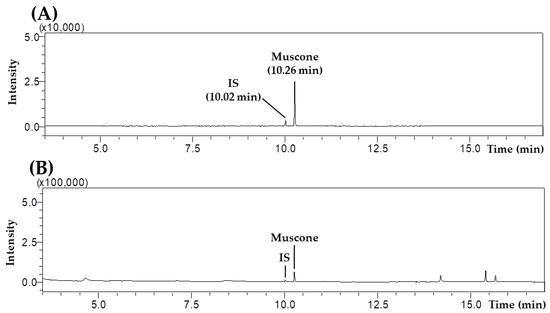 Representative GC–MS/MS chromatograms of the standard solution (A) and GJD–1 sample (B). The concentrations of muscone and IS in the mixed standard solution were 5.00 µg/mL and 1.00 µg/mL, respectively.