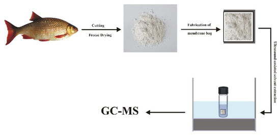 A membrane bag (2.0 cm × 2.0 cm) with one open end was fabricated from a flat PP membrane sheet with the assistance of a heat-sealer. The open end of the membrane bag was also heat-sealed after packing with 500 mg of dried fish samples. The sample containing a membrane bag was dipped in 3000 μL of extraction solvent (toluene) in a vial. The process of extraction was supported by application of medium-intensity ultrasound for 60 min. The membrane bag was separated from the extraction solvent using a pair of tweezers, and the extract was evaporated to dryness and reconstituted in 200 μL of n-hexane, and 1 μL aliquot was injected into the GC–MS system for analysis. The extraction procedure is shown in Figure 1.