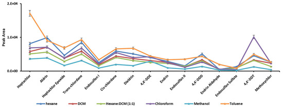The extraction solvent is most important parameter in solvent-based extraction. The interaction of the solvent with analytes as well as the solid sample contributes toward the release of the analytes. One straightforward criterion is whether the solvents have polarity match with the target compounds. However, some unknown factors related to interaction of the solvent and solid samples may provide unexpected results. Solvents with different polarity indices, such as n-hexane, dichloromethane (DCM), n-hexane:DCM, chloroform, methanol, and toluene, were evaluated in this study. The best extraction results were obtained with toluene except for aldrin, 4,4′-DDD, and 4,4′-DDT, which were better extracted in other solvents (Figure 2). Toluene effectively dilates the pores of the membrane and thus enhances overall mass transfer of analytes. Hence, it was selected as an optimum extraction solvent. However, in some cases, toluene may cause leaching of sample or deteriorate heat-sealing of membrane bag. This aspect should be carefully monitored. Such issues are less common with n-hexane.