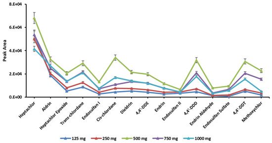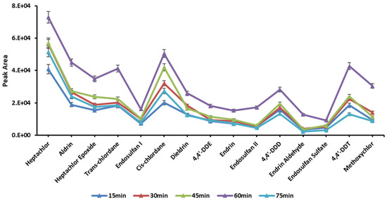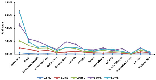 The solvent volume should completely immerse the sample-containing bag so that the solid sample particles are fully exposed to the extraction solvent. An optimum volume is the one where high concentrations of the analytes are released from the solid matrix into the solvent. The lower volumes may cause an irreproducible release of analytes, while higher volumes may be difficult to evaporate, and harsh conditions may result in loss of the target compounds. The solvent volumes were investigated in the range of 0.5–5.0 mL. The extraction was increased from 0.5–3.0 mL, but a decrease was observed in the case of 5.0 mL (Figure 3). This suggests that analytes efficiently release with an increase in solvent volume from 0.5–3.0 mL, but after 3.0 mL, solvent evaporation may cause a loss of analytes due to the increased duration of evaporation. The analytes may also adsorb back to solid samples. An exception was observed in case of heptachlor, which was best extracted in a 5 mL solvent volume.