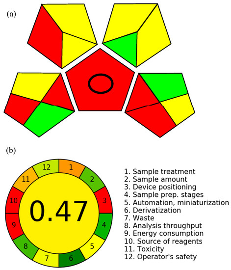 Recently, various green analytical chemistry metrics have been developed that are used to assess the greenness of analytical procedures [37,38,39,40]. The objective of these metrics is to spread awareness among the analytical community regarding the more or less green steps in their developed methods. GAPI and AGREE are two commonly used metrics for this purpose. GAPI was developed in 2018, and it evaluates the whole analytical procedure including sampling, sample preparation, the reagents and chemicals employed, energy consumption and waste generation. The outcome of GAPI is a pictogram that consists of five pentagrams. Each pentagram consists of several fields that represent a specific parameter, and the color of each field presents the environmental impact of that parameter. A red color denotes high, while yellow denotes medium, and green denotes low environmental impact. A simple look at the GAPI pictogram can reveal how many parameters are acceptable from a greenness perspective and how many need further improvement [35]. AGREE is another important green analytical chemistry metric which evaluates analytical methods based on 12 GAC principles. Its outcome is a clock-like pictogram that contains assessment of each principle and a final score. The final score ranges from 0–1. The closeness of the score to 1 indicates that the method has more green characteristics [36].