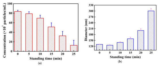 According to the classical thermodynamic theory, the theoretical existence time of nanobubbles is very short. However, some existing experiments had proved that nanobubbles could exist stably for a long time [24,25]. Figure 2 shows the relationship between the concentration and diameter of nanobubbles and the standing time when the concentration of SPA is 60 mg/L.