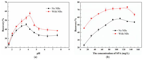 It can be seen from Figure 3b that the flotation recovery of rutile increases rapidly at first and then tends to be stable with an increase in the amount of SPA, regardless of the presence of nanobubbles. When there is no nanobubble, the concentration of SPA required for rutile flotation to reach the best flotation recovery rate (55%) is 101 mg/L. In the nanobubble system, the concentration of SPA required for rutile flotation to reach the best flotation recovery rate (69%) is only about 70 mg/L. The existence of nanobubbles not only improves the recovery rate of rutile flotation, but it also greatly reduces the amount of SPA.