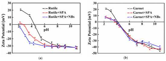 Because of the negative charge on the surface of nanobubbles, the adsorption of nanobubbles may lead to a change of zeta on the mineral surface. Figure 4 shows the effect of nanobubbles and SPA on the zeta potential of rutile and garnet surfaces.