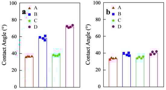 The floatability of mineral particles is determined by the hydrophobicity of the mineral surface, and the hydrophobicity of the mineral surface is determined by the contact angle between the mineral and the water solution interface [7,26]. The influence of nanobubbles on the contact angle of the solid–liquid interface on the mineral surface is shown in Figure 5.