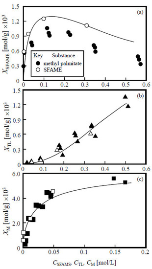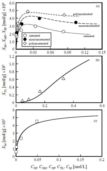 The data shown in Figure 1 were applied to Equations (5)–(9), and using a least squares regression, the adsorption parameters could be determined. The values of the parameters are summarized in Table 5. Figure 2 shows the fitting of the data of Figure 1 to Equations (5)–(9). The solid, dashed, and dotted lines are the calculated values using the adsorption parameters in Table 5. As for ME and TL, they seems to be almost the same as in Figure 1b,c; in addition, they show good agreement between the experimental and calculated values. As for the SFAME, the amount of adsorbed PM was larger than that of SF and MF. In comparison to these values, KPF1 and KPF2 were 2.3- and 3.1-fold larger than KSF1 and KSF2. The value of XS was almost the same in the case of the overall SFAME adsorption. In this case of KM1 and KM2, they were 1.4-fold larger than the values in the case of the overall SFAME adsorption. The degree of unsaturation, that is, the number of double bonds between carbons, of the FAMEs was found to significantly affect their adsorption behavior on the silica surface.