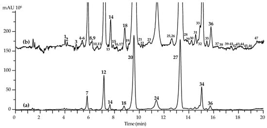 2.5. High-Performance Liquid Chromatography with Photodiode Array Detection and Electrospray Ionization Triple Quadrupole Mass Spectrometric Detection (HPLC–PDA–ESI–tQMS)
