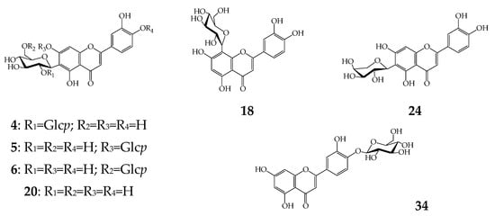 - Olennikov, D.N.; Kashchenko, N.I. New C,O-glycosylflavones from the genus Silene. Chem. Nat. Compd. 2020, 56, 1026–1034. [Google Scholar] [CrossRef]
