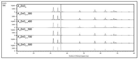The ZnO photocatalysts were synthesized by the precipitation method from water (ZnOw) and ethanol (ZnOe) solutions of the corresponding two most common metal precursors, zinc–acetate dihydrate (ACS reagent, ≥98%, Sigma-Aldrich, USA) and zinc–nitrate hexahydrate (reagent grade, 98%, Sigma-Aldrich, USA). Detailed information on the synthesis can be found in the Supplementary Material. The obtained samples of ZnO-NPs were labeled as X_ZnOw/e_Y, where X and Y designate the type of metal precursor (A for acetate and N for nitrate) and the applied calcination temperature, respectively. Due to comparison, the as-synthesized ZnO-NPs, prepared without the calcination step (A_ZnOw and A_ZnOe), were characterized, and their photocatalytic performance was tested as well.