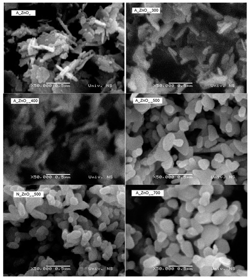 N2 adsorption–desorption isotherms, shown in the Figure 2, disclose the same type of hysteresis loop for all the examined photocatalyst samples. All isotherms represent the H3 type, the feature of textural structure with plate-like particles and slit-shaped pores. The observed hysteresis loop for all photocatalyst samples approaches P/P0 = 1, denoting the presence of macropores (>50 nm). Regardless of the catalyst synthesis medium (water or ethanol), as the calcination temperature is increased from 300 °C to 700 °C, the BET surface area shows a decreasing trend as a result of the aggregation of the ZnO particles. The pronounced impact of the synthesis medium type on the pore size distribution can be observed. Namely, the water-originating samples show almost mono-modal pore size distributions, with the majority of pores located in the higher meso- and lower macro-range. Two peaks around 3 nm and 10 nm can be considered insignificant due to their low intensity. The sintering phenomenon, as a result of the increasing calcination temperature, is also reflected in the decrease in the average pore diameter and total pore volume for the ZnO-NPs prepared from as water solution. Additionally, the substitution of the acetate precursor with nitrate does not contribute to the significant changes in textural characteristics. By examining the textural features of the ethanol-originating photocatalysts, it can be observed that these samples also undergo surface area and porosity decrease due to the calcination temperature impact, with the exception of the A_ZnOe_300 sample. This sample has a significantly higher portion of larger pores—narrower pore size distribution and higher values of porosity parameters—compared to its counterparts from both catalyst synthesis media. Figure 3 shows the SEM images of all ZnO-NPs prepared from water and ethanol solutions.
